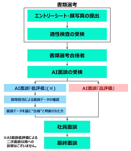 AI面接の結果、不合格判定の場合は、採用担当にて面談データを直接確認の上で合否を判断しますのでご安心ください。(AI面接の結果のみをもって自動的に不合格とはなりません。)AI面談の結果は、その後の採用選考過程(社員による二次面談の決定)のみに用い、社員による面談評価の参考資料としては利用いたしません。
